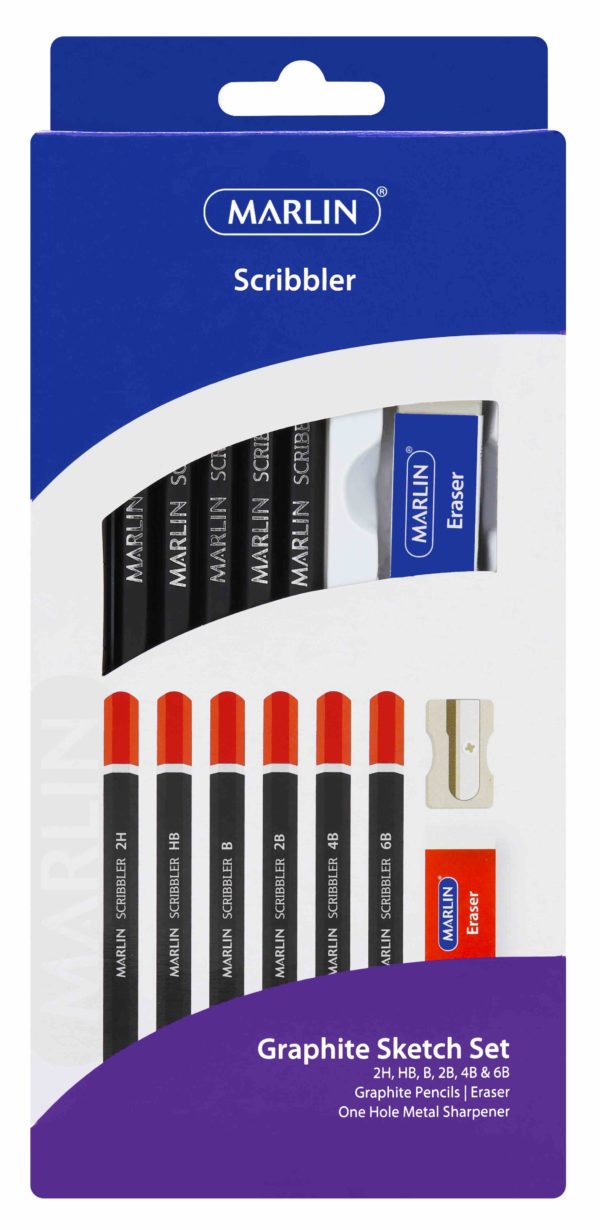 Marlin Graphite Sketch Set: 1 each x 2H/HB/B/2B/4B/6B + metal sharpener + 5x2_x1cm Eraser