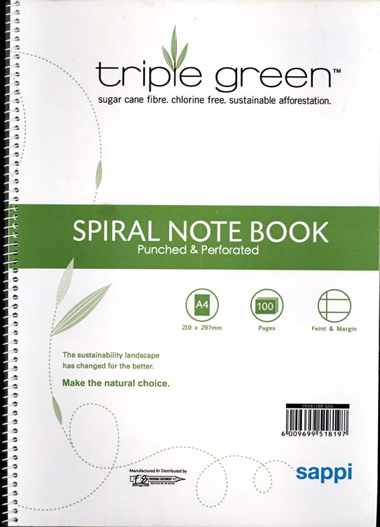 Triple Green side spiral note book A4 100 page punched & perforated