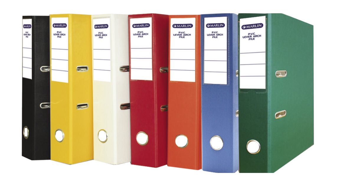 Lever arch file PVC (welded) assorted colours – metal compressor + rado clip: Black/Blue/Green/Red